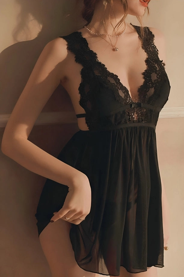 Black Sheer Short Lingerie with Dental Details, Backless & Matching Panty.