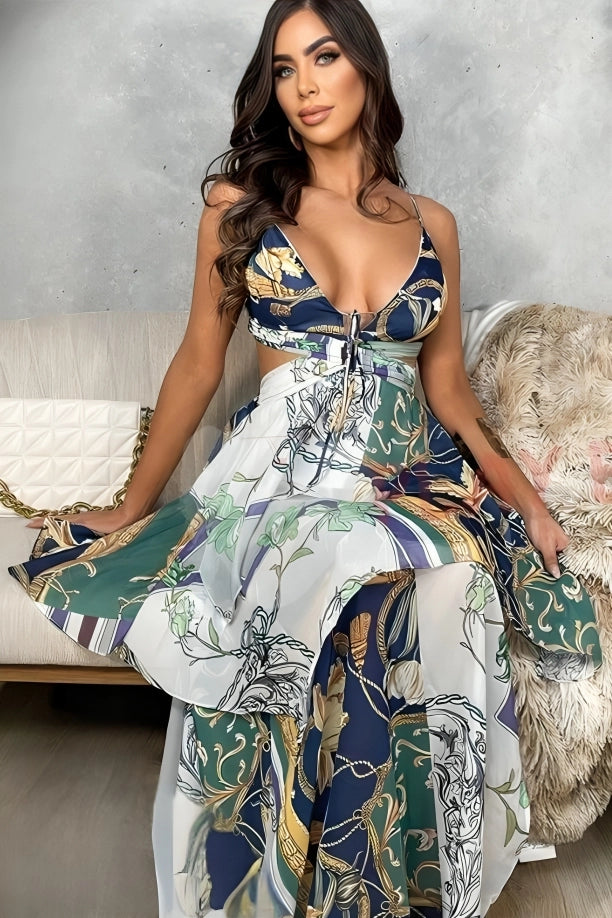 Tropical Print Maxi Dress with Overlap Collar & Backless Design.